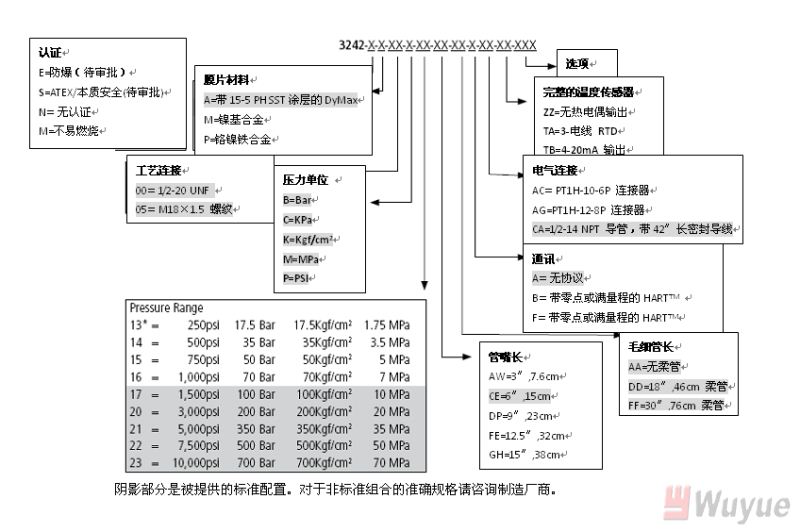 輸出,模擬:4-20mA(標(biāo)準(zhǔn)壓力,溫度可選) 輸出,數(shù)字:HART 綜合精度(錯(cuò)誤)(20-100%滿量程): ±0.25%滿量程(3M和3M以上) ±0.35%滿量程(1.5M和1.5以下) 溫度漂移(77-572℉,25-300℃): 0.001%滿量程/℉,最大(0.001%滿量程/℃,最大) 重復(fù)性:±0.1%滿量程 爆破額定壓力:2X滿量程 超壓 額定:1.5X滿量程 量程:1,500至10,000psi 可調(diào)范圍:6:1調(diào)節(jié)比,向下 負(fù)載電阻:250歐姆@18Vdc;500歐姆@23Vdc |